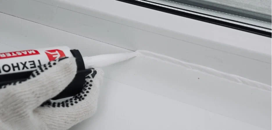 Prostor je vyčištěn od nečistot, mastnoty a vytřen alkoholem. Po zaschnutí se mezery bohatě vyplní silikonovým tmelem. Hmota je rovnoměrně vytlačena podél spojení okna s vodorovnou rovinou. Přebytečná kompozice se odstraní kloubovou špachtlí nebo mincí.